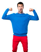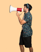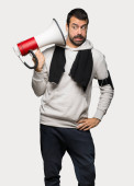 Przystojny młody mężczyzna trzyma megafon na białym tle