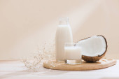 Produkty mleczne. Butelki z mlekiem i szklankę mleka na drewnianym stole