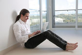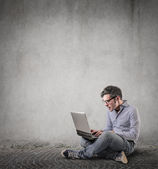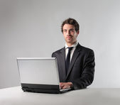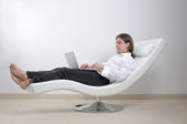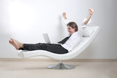Młody biznesmen, siedząc na kanapie z jego laptop i pracy.