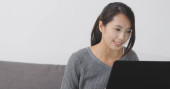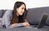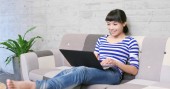 Gospodyni domowa, praca na komputerze przenośnym w domu