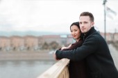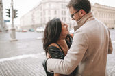 Szczęśliwa para młodych stylowe przytulanie i uśmiechając się nawzajem na ulicy.