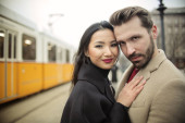 Zdjęcie "Szczęśliwa para młodych stylowe przytulanie i uśmiechając się nawzajem na ulicy." może być wykorzystywane do celów osobistych i komercyjnych zgodnie z warunkami zakupionej licencji Royalty-free. Obraz jest dostępny do pobrania w jakości wysokiej rozdzielczości do 5760x3840.