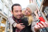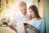 Szczęśliwa para młodych, biorąc selfie na zakupy ulicy.