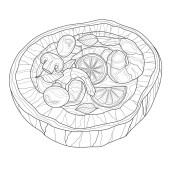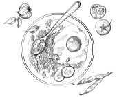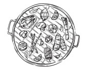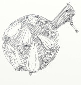 na patelni z czosnkiem i pieczarkami, starożytny żywności i obiekty związane z domu i do kuchni