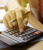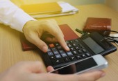 Ręcznie za pomocą kalkulatora na office desk inwestycji i właściwości dla koncepcji.