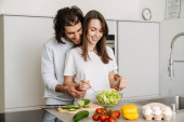 Portret miłości para młodych, wspólne gotowanie w kuchni