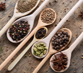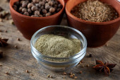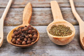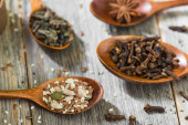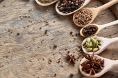 Zdjęcie "Różnych przypraw w drewniane łyżki i miski i sól na stare drewniane beczki, widok z góry, zbliżenie, selektywnej ostrości." może być wykorzystywane do celów osobistych i komercyjnych zgodnie z warunkami zakupionej licencji Royalty-free. Obraz jest dostępny do pobrania w jakości wysokiej rozdzielczości do 5760x3840.