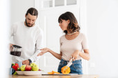 Portret atrakcyjna Młoda para, wspólne gotowanie w kuchni