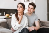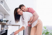 Portret miłości, Młoda para przytulanie stojąc w kuchni w domu