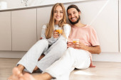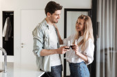 Portret szczęśliwy Młoda para relaksujący na kanapie z kieliszków wina w domu