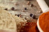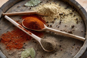 Zdjęcie "Widok z góry z drewniane łyżki pełne paprica i czarny pieprz na podłoże drewniane beczki, Selektywny fokus." może być wykorzystywane do celów osobistych i komercyjnych zgodnie z warunkami zakupionej licencji Royalty-free. Obraz jest dostępny do pobrania w jakości wysokiej rozdzielczości do 5760x3840.