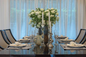 Zdjęcie "Luksusowy stół jadalny ze stołem w jadalni klasyczny, drewniany stół z styl klasyczny fotel, koncepcja projektowania wnętrz" może być wykorzystywane do celów osobistych i komercyjnych zgodnie z warunkami zakupionej licencji Royalty-free. Obraz jest dostępny do pobrania w jakości wysokiej rozdzielczości do 5760x3840.