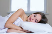 Piękna Kobieta przytula jej poduszkę podczas snu w łóżku.