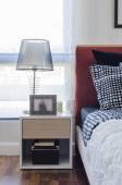 Przytulny pokój w klasycznym stylu z zestawem poduszek i lampka na stolik, koncepcja projektowania wnętrz