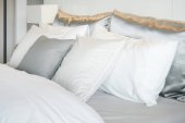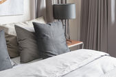Przytulny pokój w klasycznym stylu z zestawem poduszek i lampka na stolik, koncepcja projektowania wnętrz