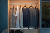 Koszule, wiszące kolei w drewnianej szafie styl klasyczny, styl klasyczny szafa z ubrania wiszące, koncepcja projektowania wnętrz