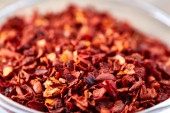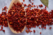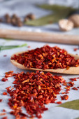 Red hot chili pieprz płatki w drewnianą łyżką na białe tło teksturowane, widok z góry, zbliżenie, selektywnej ostrości.
