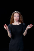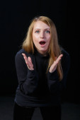 Wesoły młodych Blondynka śmiejąc się na czarnym tle