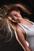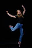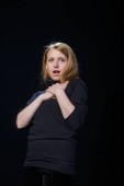 Przestraszony piękną, młodą kobietę na czarnym tle
