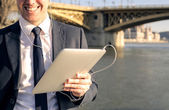Młody biznesmen z laptopa na szczęście słuchania muzyki na zewnątrz słuchawki.