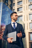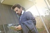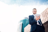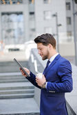 Młody biznesmen, siedząc na most i dotykając jego laptop.