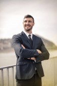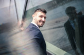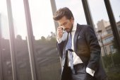 Młody biznesmen rozmowy na smartfonie przed nowoczesnym budynku.