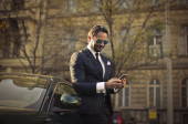 Zdjęcie "Młody biznesmen, pokazując jego smartfon z aparatem i uśmiechając się." może być wykorzystywane do celów osobistych i komercyjnych zgodnie z warunkami zakupionej licencji Royalty-free. Obraz jest dostępny do pobrania w jakości wysokiej rozdzielczości do 5760x3840.