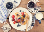 Małe babeczki z jagodami, truskawkami i wiśnie. Pyszne śniadanie na słodko i aromatycznej kawy, na niebieskim tle drewnianych i kwiaty. Kopiować miejsca. Powyżej. Układ płaski