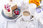 Zdjęcie "Małe babeczki z jagodami, truskawkami i wiśnie. Pyszne śniadanie na słodko i aromatycznej kawy, na niebieskim tle drewnianych i kwiaty. Kopiować miejsca. Powyżej. Układ płaski" może być wykorzystywane do celów osobistych i komercyjnych zgodnie z warunkami zakupionej licencji Royalty-free. Obraz jest dostępny do pobrania w jakości wysokiej rozdzielczości do 5760x3840.