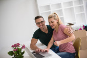 Zdjęcie "Szczęśliwa para młodych w ich nowym domu, pokazując Ok i uśmiech." może być wykorzystywane do celów osobistych i komercyjnych zgodnie z warunkami zakupionej licencji Royalty-free. Obraz jest dostępny do pobrania w jakości wysokiej rozdzielczości do 5760x3840.