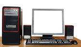 Komputer stacjonarny pc, monitor, klawiaturę i mysz na białym tle