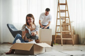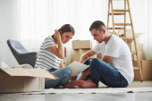 Zdjęcie "Szczęśliwa para młodych, co niektóre zabawy razem w ich nowym domu." może być wykorzystywane do celów osobistych i komercyjnych zgodnie z warunkami zakupionej licencji Royalty-free. Obraz jest dostępny do pobrania w jakości wysokiej rozdzielczości do 5760x3840.