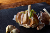 Czosnek części z bliska na ciemny ścięta na drewnianym stole, płytkiej głębi pola, Selektywny fokus, makro