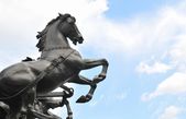 Posąg jeźdźca w Plaza Mayor (Madryt) Hiszpania, dramatyczne niebo