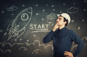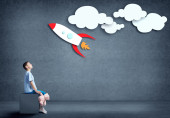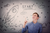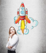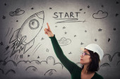 Portret uśmiechnięta dziewczyna student, wskazując jej palcem w górę, pokazując take ciągnione rakietę w przestrzeni. Rozpoczęcie działalności i rozwoju, wzrostu do gospodarki, nowy projekt inwestycji.