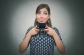 Przerwa na kawę. Czas kawy. Przerwy na lunch. Miłość do kawy. Kobieta trzyma w ręce filiżankę kawy i pachnie to na białym tle na szarym tle.