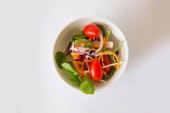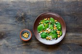 Wegańskie energii zwiększenie buddha bowl. Zdrowe ciecierzycy, szpinaku, pomidory, Kapusta czerwona, orzechy i miód sos na jasnym tle. Dieta, dieta koncepcja. Vegan food, zdrowe jedzenie. Widok z góry, płaskie świeckich