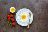 Płaskim położyć rano śniadanie w płytkę z wędzonym łososiem, smażone jajka, pomidory i ogórek na jasnym tle betonowych widok z góry. Dobre tłuszcze zdrowe jedzenie koncepcja.