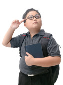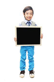 Azjatycki student tłuszczu przytrzymanie puste tablica na białym tle