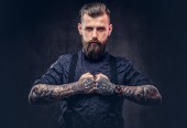 Portret przystojny staromodny w niebieską koszulę i szelki. Na białym tle na ciemnym tle.