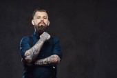Zamyślony przystojny staromodny w koszuli i szelki, pozować z ręki na podbródek. Na białym tle na ciemnym tle.