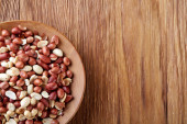 orzeszki ziemne w płycie clay na tle drewnianych. miejsce dla tex
