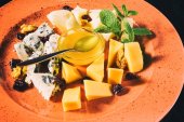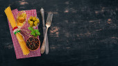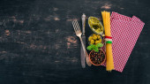 Zdjęcie "Asortyment kiełbasy, sera i świeżych warzyw. Dania kuchni włoskiej. Na czarnym tle drewnianych. Widok z góry. Miejsce." może być wykorzystywane do celów osobistych i komercyjnych zgodnie z warunkami zakupionej licencji Royalty-free. Obraz jest dostępny do pobrania w jakości wysokiej rozdzielczości do 5760x3840.