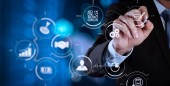 Zarządzanie procesami biznesowymi z diagram automatyzacji przepływu pracy i narzędzi w wirtualnej flowchart.businessman sukces pracy komputera ekran dotykowy z zespołem jako koncepcja