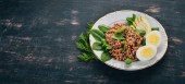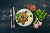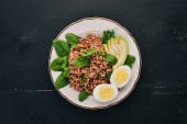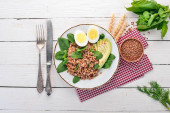 Kasza gryczana z awokado, szpinaku i jajko na twardo. Na tle drewnianych. Widok z góry. Miejsce.