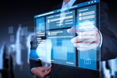 Zdjęcie "AR ekranu wirtualnego pulpitu nawigacyjnego zarządzania projektami z ikonami, planowanie, budżetowanie, communication.businessman pokazuje nowoczesnej technologii jako koncepcja" może być wykorzystywane do celów osobistych i komercyjnych zgodnie z warunkami zakupionej licencji Royalty-free. Obraz jest dostępny do pobrania w jakości wysokiej rozdzielczości do 5760x3840.