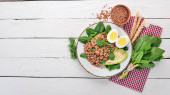 Makaron ze szpinakiem, awokado i jajko na twardo. Na tle drewnianych. Widok z góry. Miejsce.