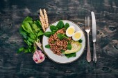 Kasza gryczana z awokado, szpinaku i jajko na twardo. Na tle drewnianych. Widok z góry. Miejsce.