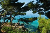Widok na morze w Hiszpanii. Wakacje na Costa Brava. Niebieskie fale i skał. Piaszczysta plaża.