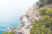 Widok na morze w Hiszpanii. Wakacje na Costa Brava. Niebieskie fale i skał. Piaszczysta plaża.